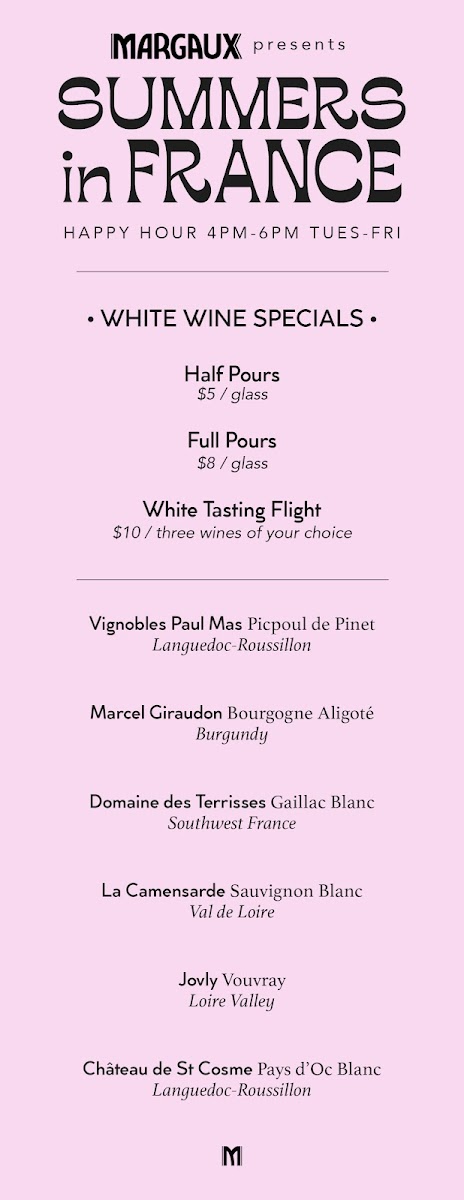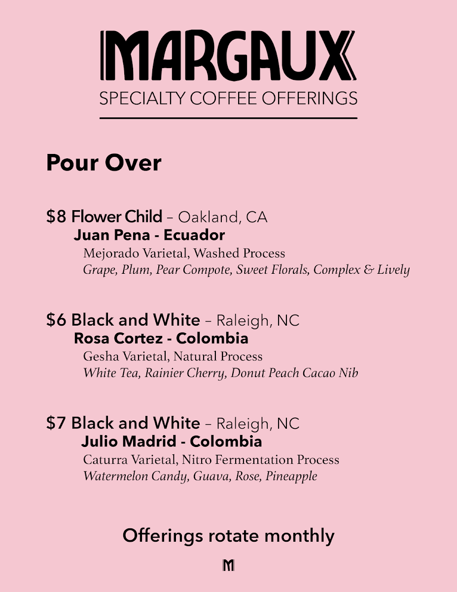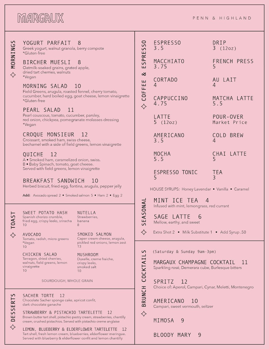 Margaux offers a thoughtfully curated menu that blends the simplicity of a café with the relaxed charm of a neighborhood brunch spot and wine bar. The menu features approachable, comforting dishes and drinks designed to suit moments throughout the day—from a morning pick-me-up to a leisurely midday meal or a casual evening with friends.