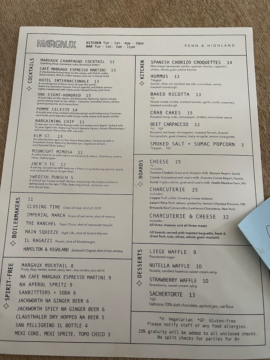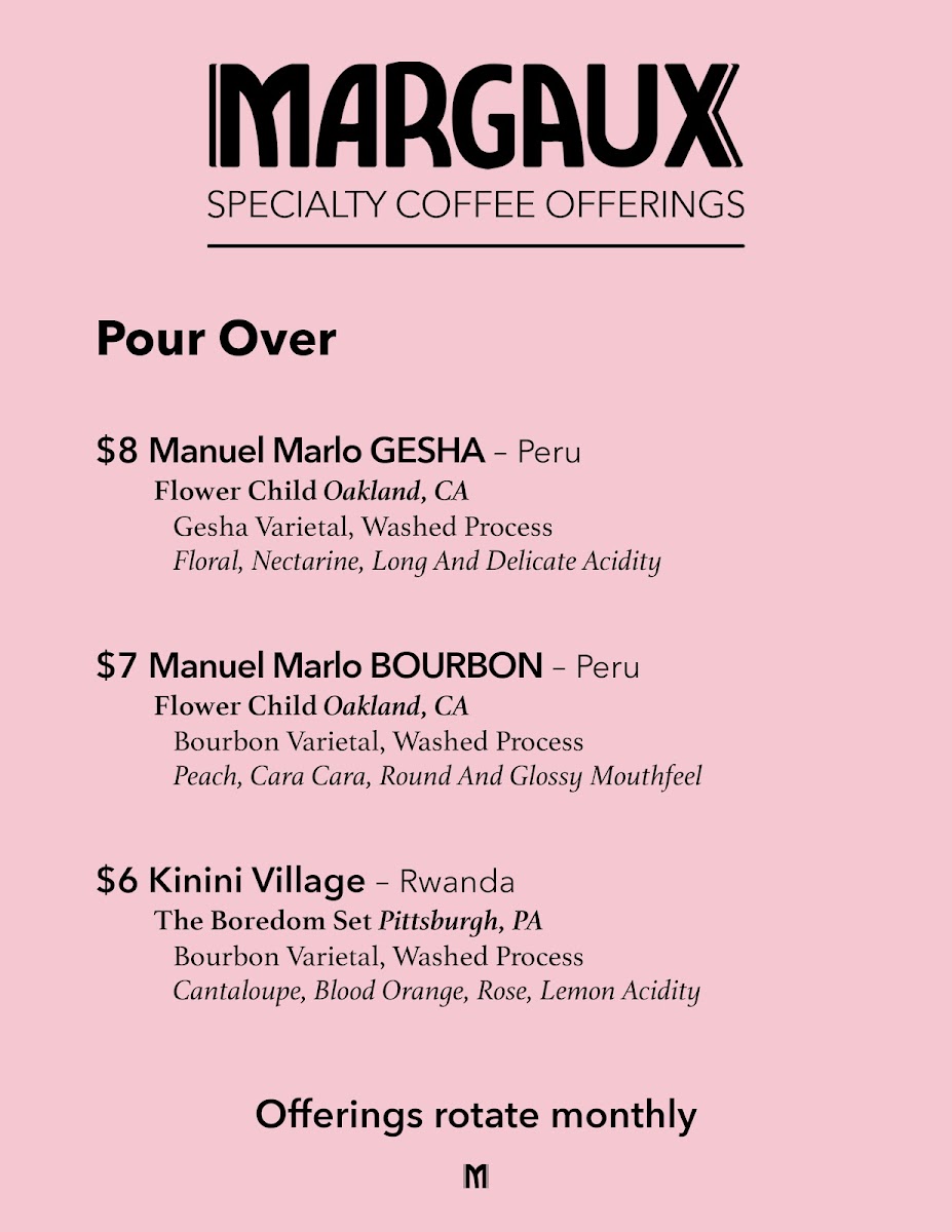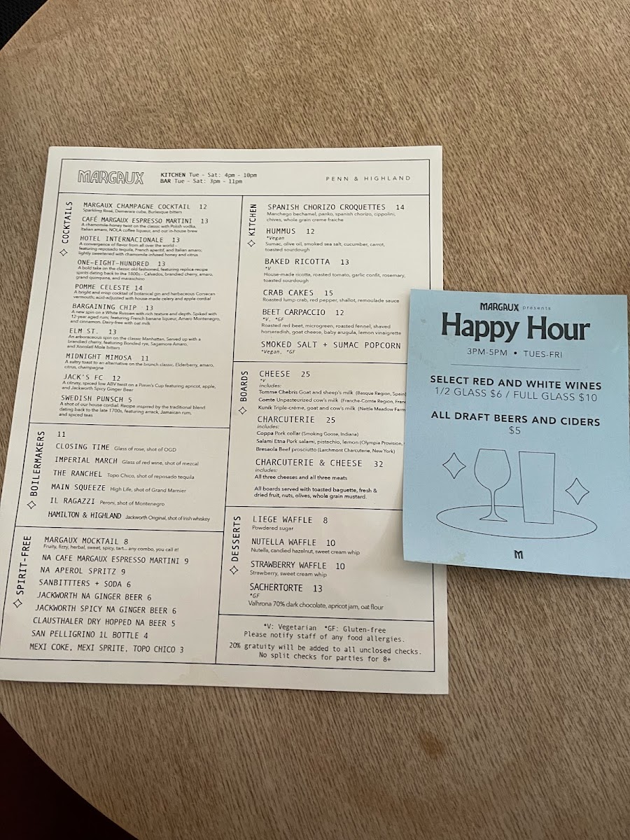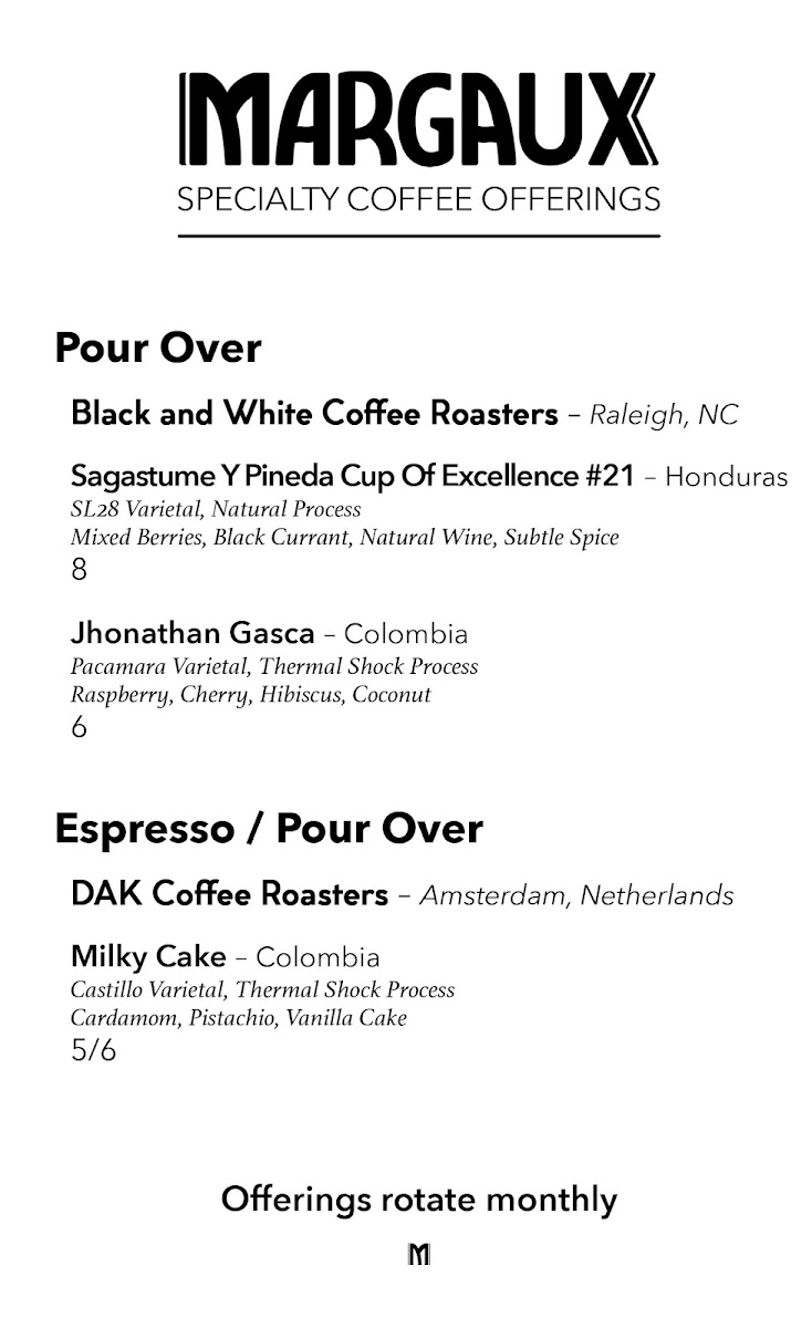 The overall atmosphere at Margaux is reflected in its menu: approachable yet thoughtful, with a smooth transition from vibrant café culture to an intimate wine bar setting. Whether you're settling in to work with a drip coffee or unwinding over a cocktail as night falls, the menu supports both comfort and quiet enjoyment.