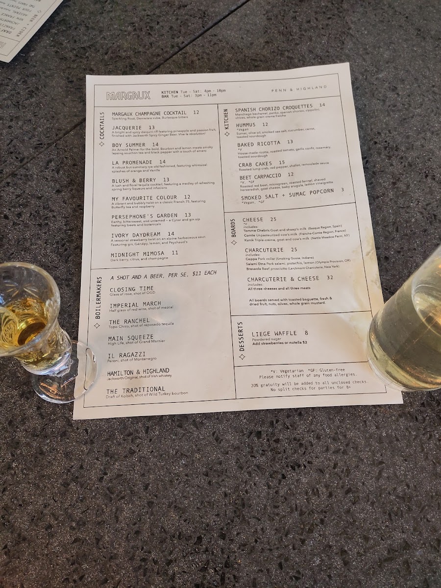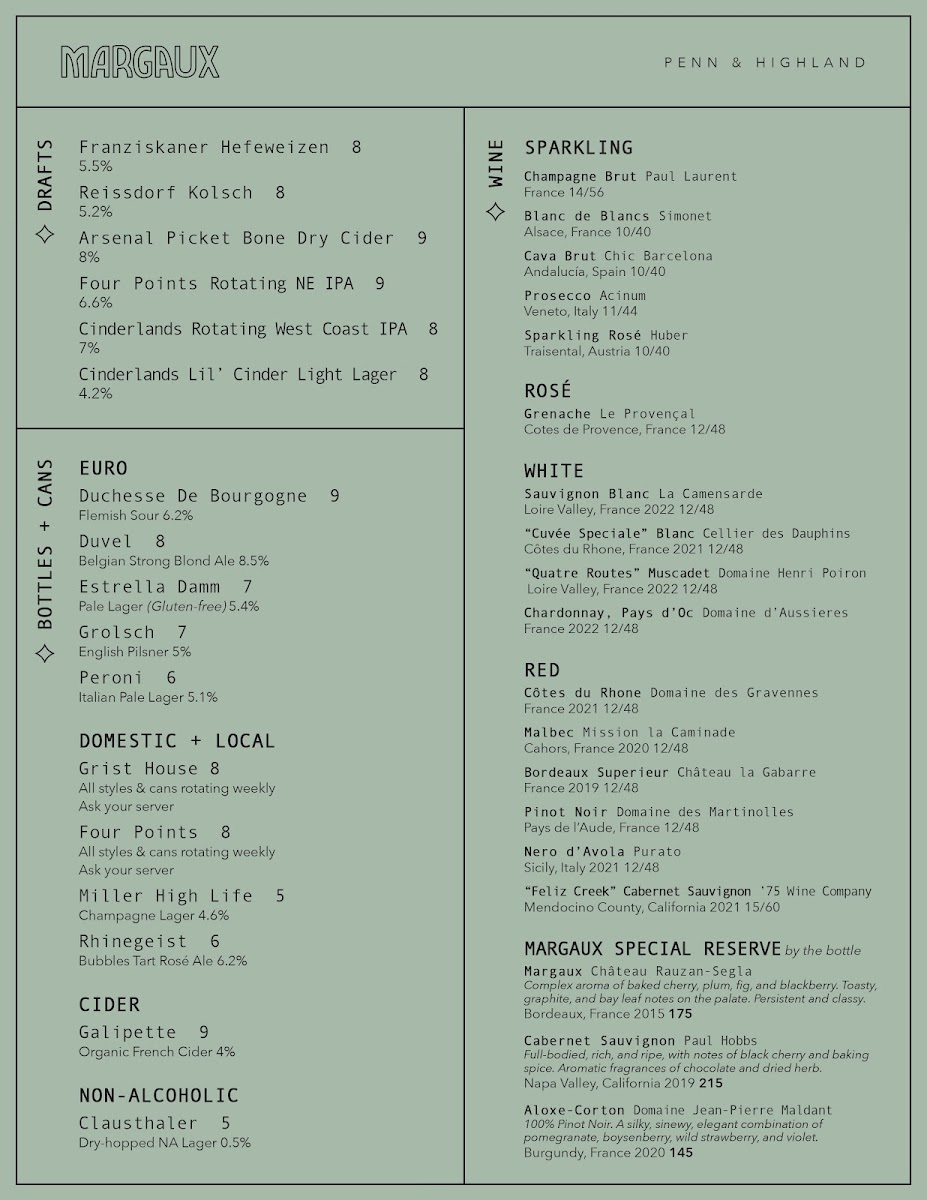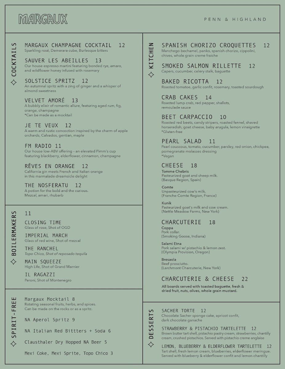 The overall atmosphere at Margaux is reflected in its menu: approachable yet thoughtful, with a smooth transition from vibrant café culture to an intimate wine bar setting. Whether you're settling in to work with a drip coffee or unwinding over a cocktail as night falls, the menu supports both comfort and quiet enjoyment.